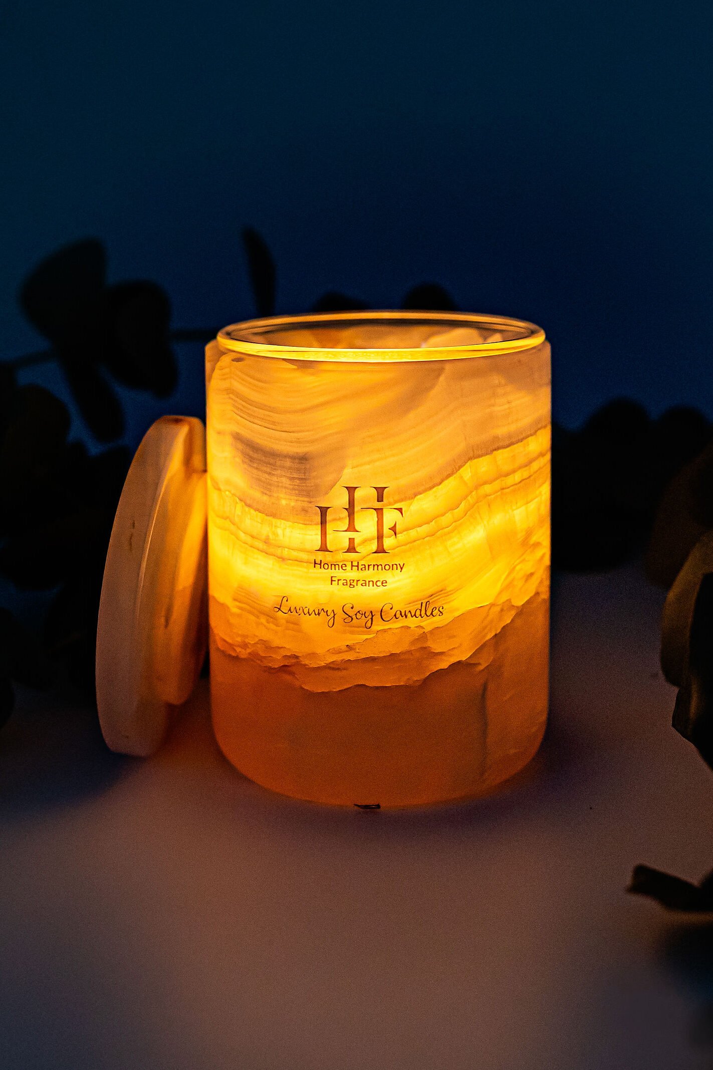Deganti liepsna onikso žvakidėje atsiskleidžia ypatingai – šviesa tampa gilesnė ir jaukesnė.